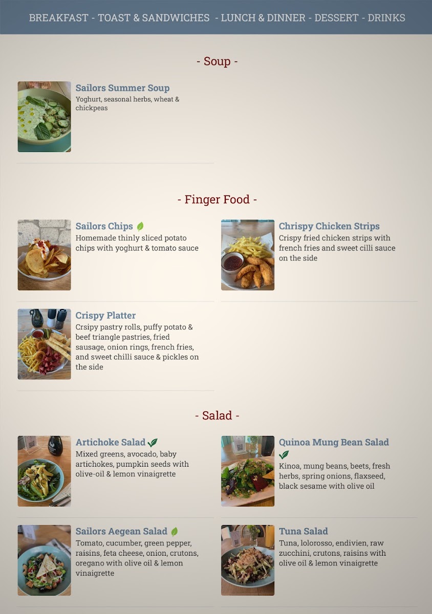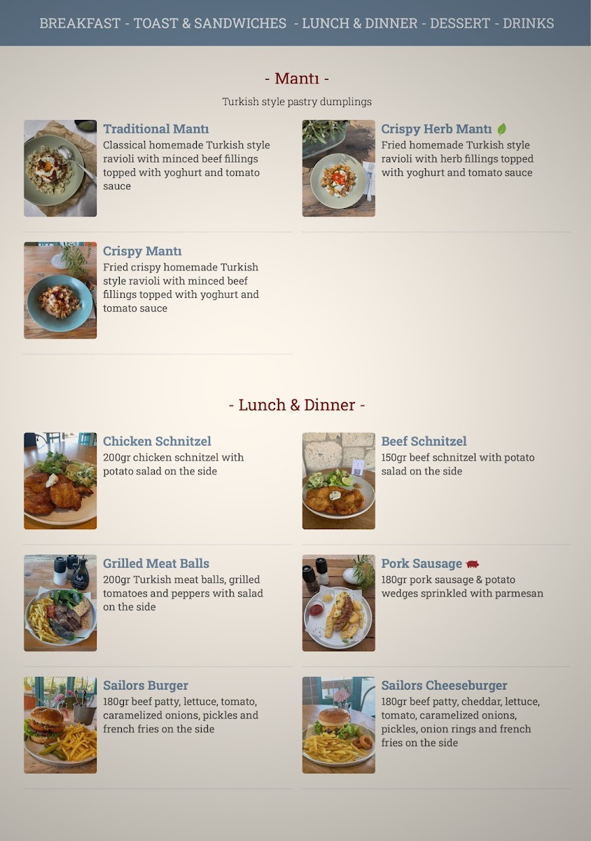 Introducing the menu at Sailors Alacatı is a delightful journey filled with innovative flavors and a cozy ambiance. Nestled in the charming town of Alaçatı, the restaurant showcases a vibrant all-day breakfast concept, allowing guests to enjoy dishes until 7 PM. Customers rave about their signature acai bowl, praised as the best in the area, alongside refreshing iced lattes and invigorating green juices.